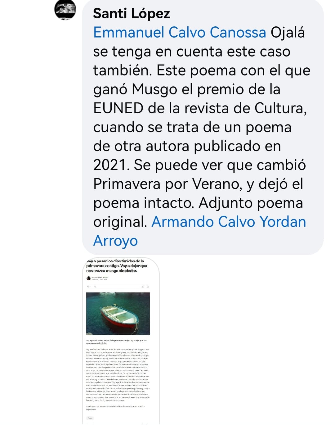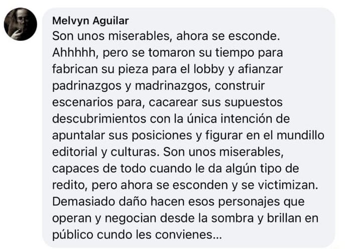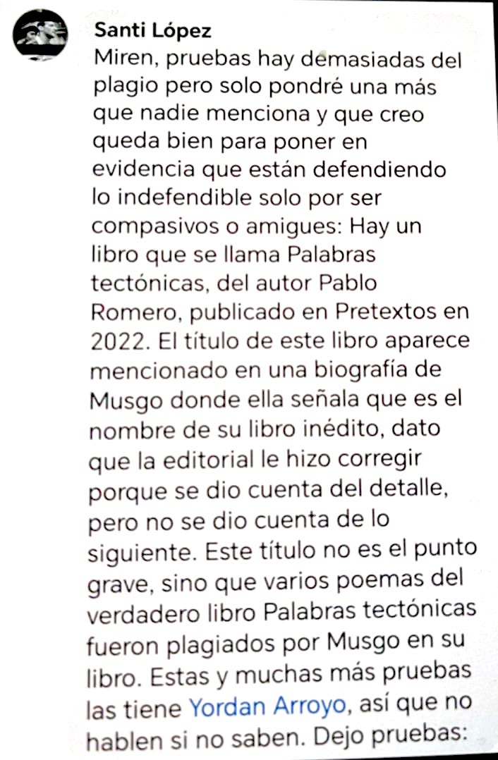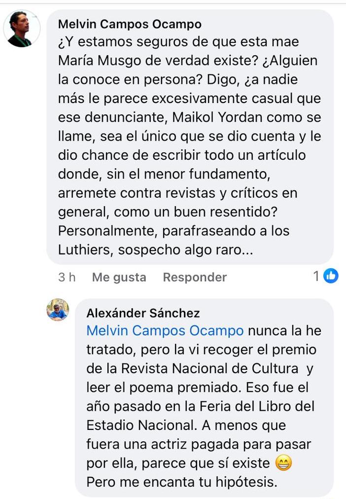 Por el momento, merece mucho la pena tener en cuenta dos comentarios hallados en Facebook en torno al fenómeno María Musgo, el de los escritores Miguel Cortés (Asuero poeta) y Melvin Aguilar, quienes lanzan una duda, a modo de dardo: ¿Y si se demostrase que el caso María Musgo es acción de varias personas, de un lobby, frente a qué fenómeno estaríamos? (15 de febrero de 2025 y 9 de febrero de 2025). Y aquí agrego, si ese fuera el caso ¿podría tratarse de una acción común y eventual, de un aparente plagio, asunto que sucede quizás todos los días, en diferentes partes del mundo y en diferentes ámbitos (literarios y académicos) de manera muchas veces insignificante, o de actos en donde han participado organizaciones que en otros países de habla hispana, como México, Colombia, Perú y España denominan capillas y, en situaciones más complejas, mafias literarias?[3] A este planteamiento del problema estaré regresando en otras publicaciones.