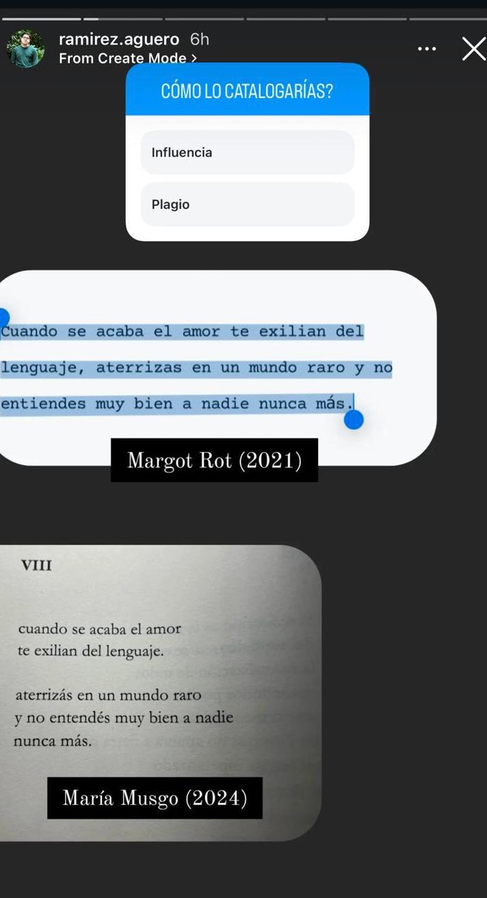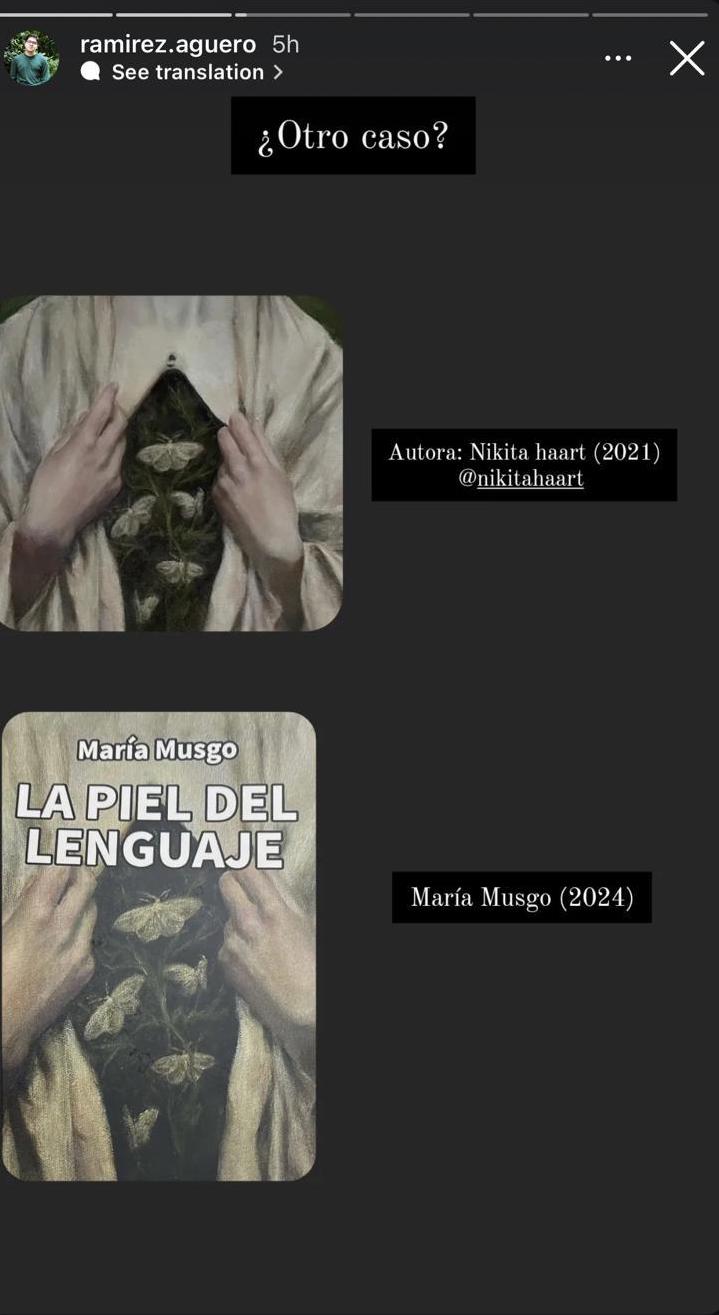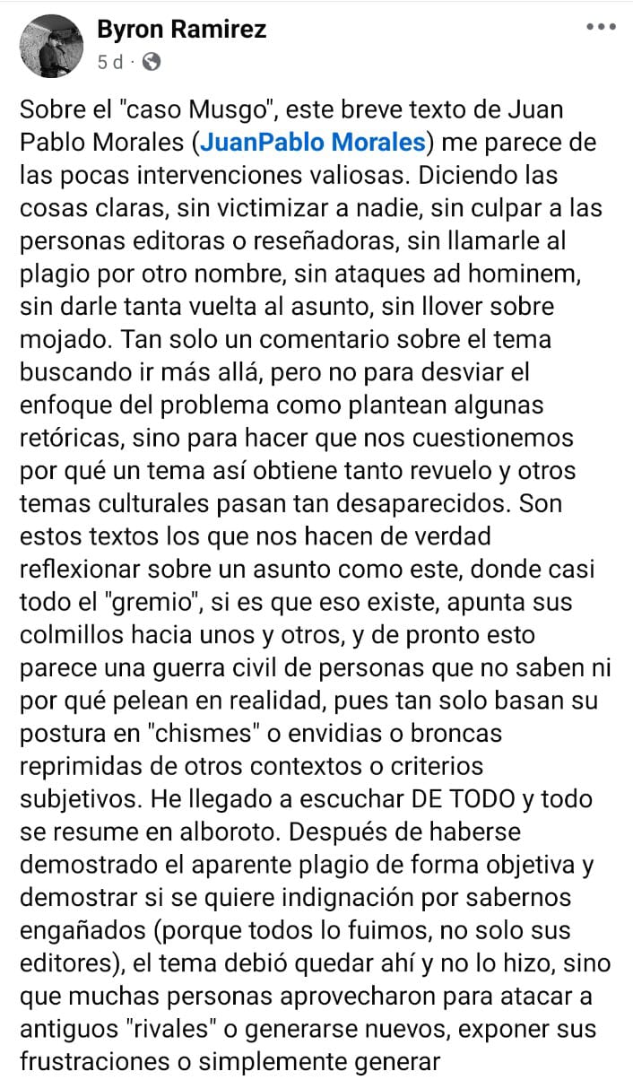 Me referiré, más adelante, a reacciones sorprendentes de algunos de los actores sociales que estuvieron en la construcción del fenómeno literario que nos ocupa. Dicho esto, es necesario precisar que las primeras sugerencias de duda sobre la naturaleza de los textos de María Musgo provienen del perfil personal de Instagram del poeta, exprofesor y estudiante de la Universidad de Costa Rica, Byron Ramírez Agüero. Él advirtió, por primera vez públicamente, el 6 de febrero de 2025, supuestas acciones de plagio en el libro La piel del lenguaje (2024) de María Musgo y al día siguiente, el 8 de febrero de 2025, hizo una publicación, en su cuenta personal de Facebook, acerca de lo que implica un plagio. Allí sugiere asuntos emocionales, personales y psicológicos detrás de una persona plagiadora y que, según él, deben ser tratados por profesionales lo más pronto posible. ¿Pero cuáles son estos aspectos emocionales, personales y psicológicos y por qué darle espacio a este asunto en el caso María Musgo? Quizás para aclarar que la única responsable es quien cometió el acto cuestionado o quizás no. Para confirmar mi postura crítica, el sábado 15 de febrero de 2025, también a través de su cuenta personal de Facebook, relativizó, con mayor énfasis, las posibles responsabilidades de la persona que cometió el posible plagio y también de otras personas cercanas a ella, que dieron credibilidad a su trabajo, para reducir el problema cultural vivido a simples rencillas.
