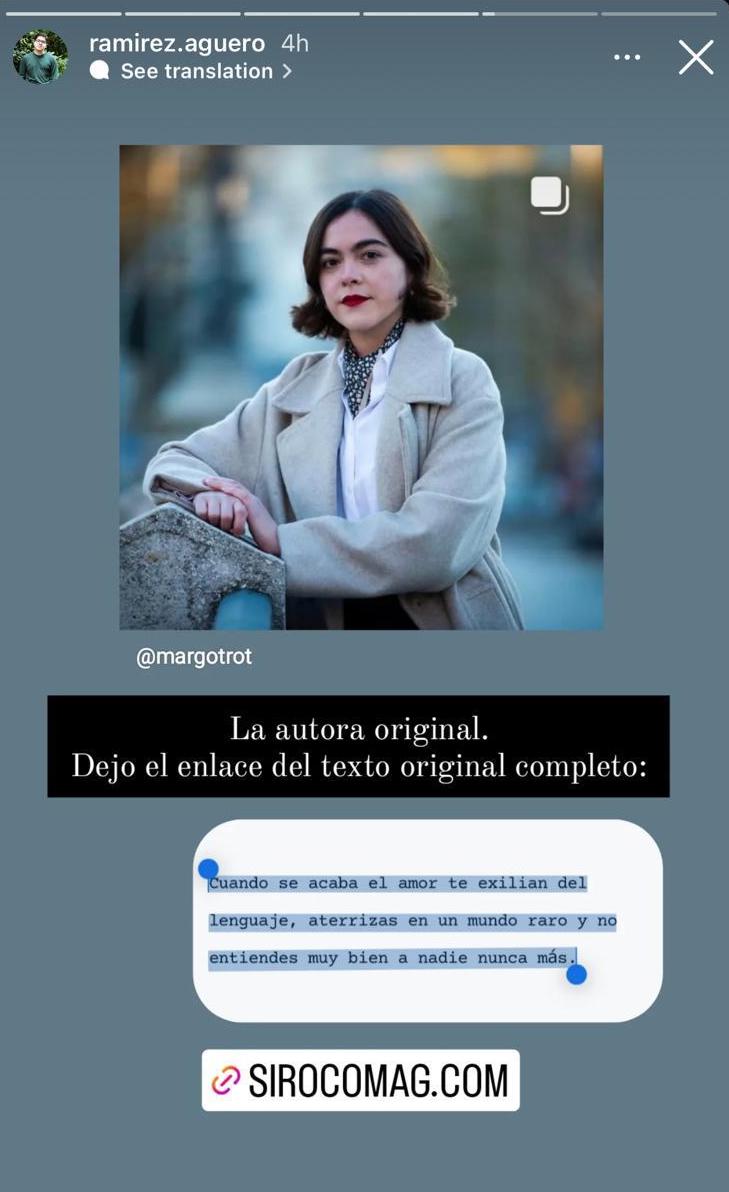 [19] Aunque esto es un error. Los textos publicados en libros, por ejemplo, por Alejandra Pizarnik son de ella, así estén en Instagram como supuestos anónimos. Aquí debe imperar la sensatez (alta cultura) del internauta a la hora de enfrentarse a dinámicas de la baja cultura mediática en el ultrapostmodernismo fragmentado.