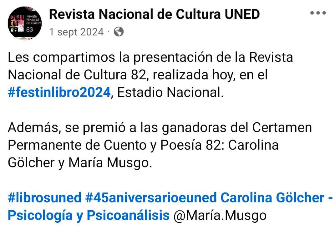 - Publicación del lanzamiento de la Revista de Cultura de la EUNED donde se registran los respectivos ganadores en poesía y cuento (1 de septiembre de 2024):