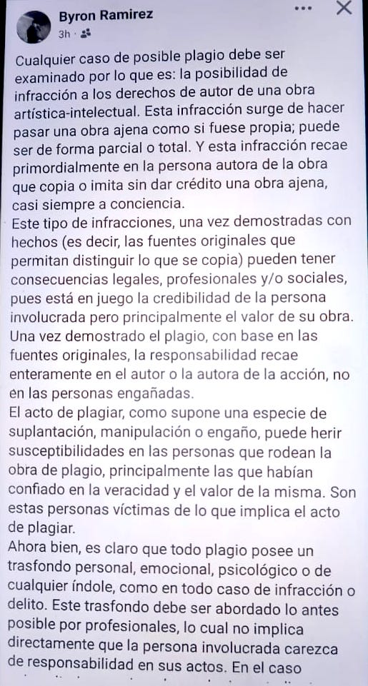 Posterior a la publicación de mi primer artículo, según he sabido, se iniciaron otras aportaciones dentro y fuera de Costa Rica, aparecieron alertas en otros países, advirtiendo la necesidad de cambios urgentes en las normativas y sistemas administrativos de muchas revistas, editoriales y premios literarios y surgieron, a manera de “réplica”, una cantidad considerable de publicaciones en “Instagram” y en “X” (varias de ellas tergiversadas, convertidas en chisme), dos noticias en el periódico “CulturaCR.net” (con réplicas masivas[2]), un artículo periodístico, a cargo de Juan Pablo Morales Trigueros, en la plataforma de Abecedaria Editoras y una entrevista, a cargo de Geovanny Debrús Jiménez (encargado de “Culturacr.net”), quien luego de haber publicado dos noticias basadas en mi artículo habla, en una entrevista acerca del tema “plagio”, de hallazgos y términos propios de este servidor, pero omite citar mi autoría. En fin, la noticia se terminó convirtiendo en lo mismo que pretendo cuestionar, en el sistema del presente ultrapostmoderno fragmentado.