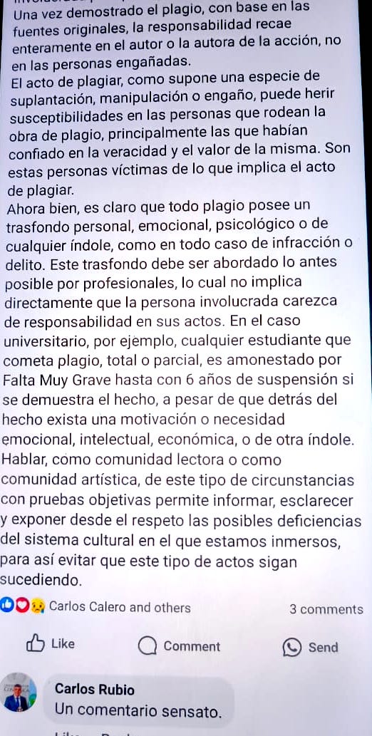 Por otra parte, también con respecto a las primeras insinuaciones de plagio, en Instagram, se hace énfasis en lo que alguien dijo sobre la supuesta obra de María Musgo. No se especifica el nombre de dicha persona ni sus palabras. Más allá de las reacciones diversas, se ha desatado una polémica, por una parte, con interpretaciones defensivas, victimización, adhesiones y solidaridades, y por otra, demandas de esclarecimiento, búsqueda de responsabilidades y facilitadores. El problema sigue vivo y requerido de soluciones, porque el hecho no es menudencia: implica personas, instituciones y , aparentemente, hasta posible uso de fondos públicos.
