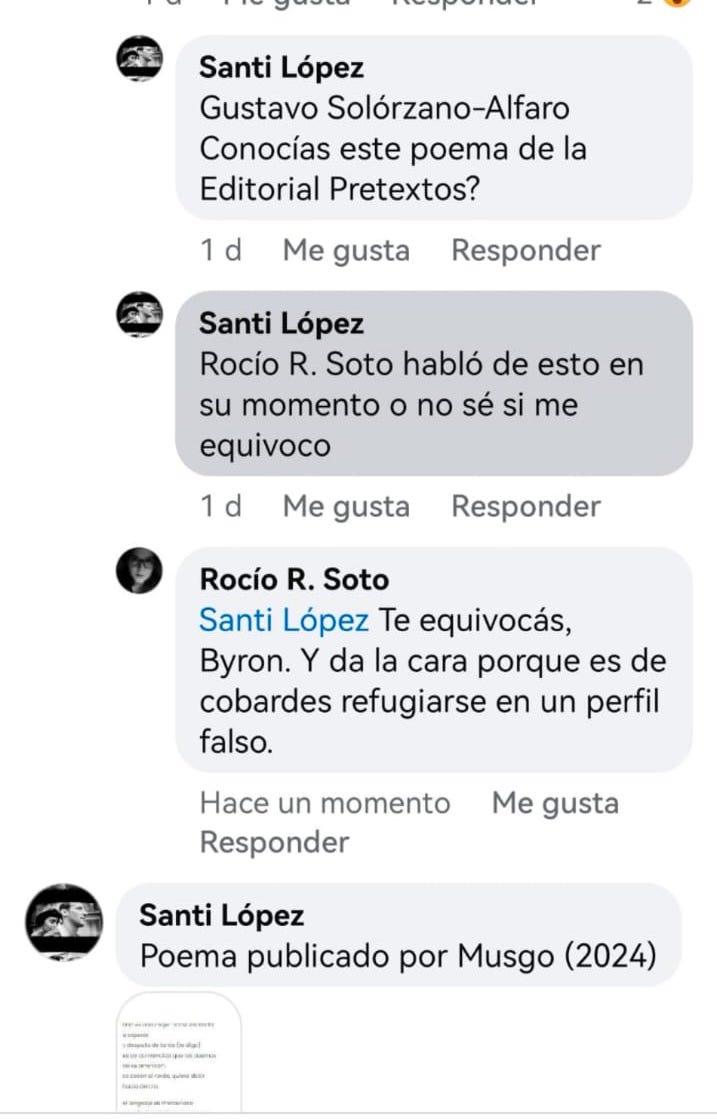 Si algo queda de momento claro es que posterior a las publicaciones de Ramírez Agüero comenzaron ciertas acciones a través de perfiles falsos de Facebook como el de “Santi López”. A partir de este punto es posible ubicar ataques directos contra Gustavo Solórzano Alfaro, cuyo nombre se expone públicamente. ¿Quién o quiénes tienen o podrían tener problemas con él y por qué? ¿Cuáles son las relaciones de este escritor y crítico con la supuesta autora de los plagios? Estas son preguntas difíciles de resolver y abriría el camino a hipótesis cuando no, a suposiciones. Sin embargo, es importante saber que detrás de “Santi López” también existen otros perfiles falsos y frente a este dato desconcertante es necesario detenerse unas cuántas horas, salirnos de las redes sociales y preguntarnos ¿Qué aspectos ontológicos debemos analizar de estas dinámicas cibernéticas? ¿Desde cuándo empezaron las prácticas de censura al pensamiento crítico y de ataques a través de perfiles falsos? ¿Qué tiene que ver esta coyuntura así llamada “María Musgo” con el estado actual de la cultura costarricense? ¿Es posible establecer nexos entre cultura, literatura y política, cuáles, por qué y cómo?