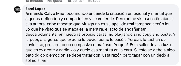 4) Falta de formación de ciertas personas para detectar plagio, porque siempre, según parece, se termina dependiendo de “otros” para que asuman la tarea: Este punto es muy valioso. En este sentido la explosión del caso María Musgo ha resultado muy necesario para abrir una reflexión crítica respecto a las precauciones y medidas que deben tomarse ante una cultura del espectáculo cada vez más dependiente de realidades impostadas. Esto incrementa los deseos de fama, cancelación, grosería, cinismo, soberbia y falsedad. El interés, sea individual o para una o varias capillas literarias, por obtener cada vez más reconocimientos y poder en esferas cibernéticas y de la manera más acelerada posible, anquilosa el pensamiento de cualquier ser humano y lo convierte en su rehén, conduciéndolo a cometer acciones apresuradas.