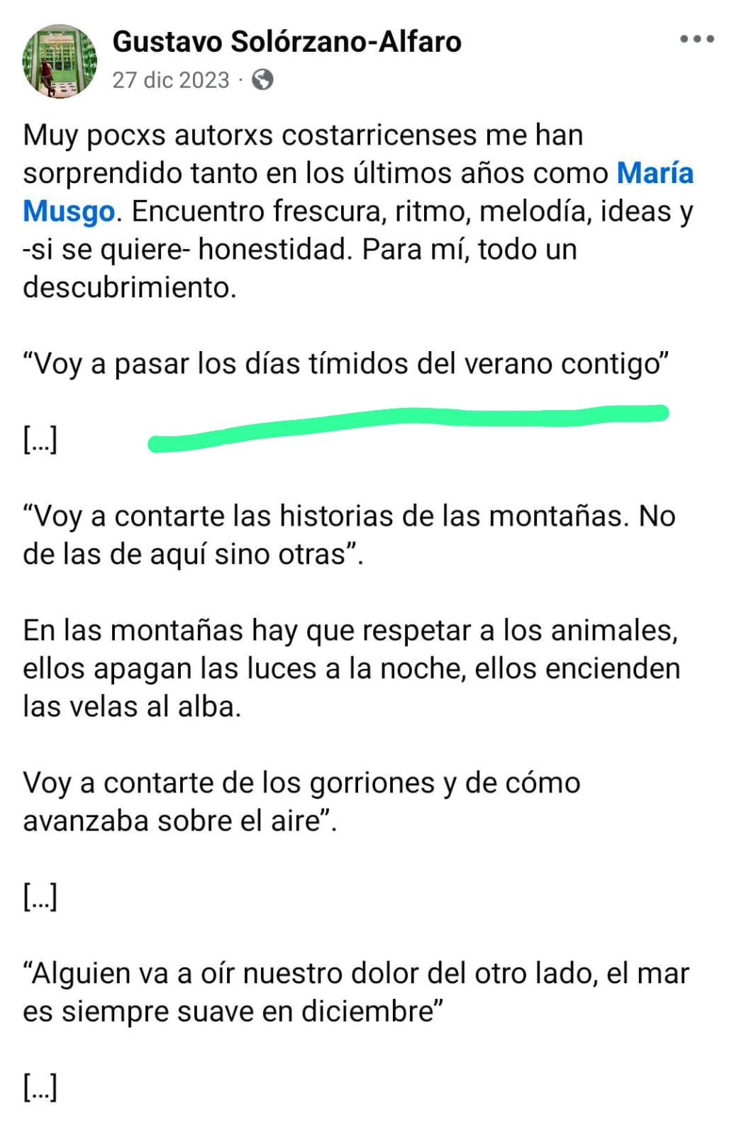 - Primera publicación de Gustavo Solórzano Alfaro respecto al poema que resultó ganador del Premio Permanente de Poesía de la EUNED de la Revista Cultura y las primeras elevaciones de María Musgo en el escenario literario hispanoamericano (27 de diciembre de 2023):