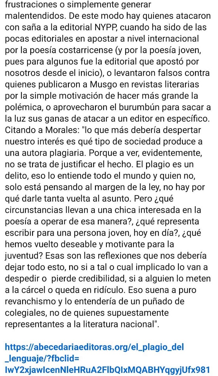 Por otro lado, en términos jurídicos costarricenses, debido a que la Ley sobre Derechos de Autor y Derechos Conexos (Ley N.º 6683) que materializa el convenio de Berna y el Tratado de la OMPI sobre Derecho de Autor (WCT) cubre de responsabilidades jurídicas a quien haya publicado textos con visos de plagio, en caso de ser este comprobado, el siguiente paso sería investigar qué cláusulas contiene el contrato diseñado por la editorial que haya publicado esos textos. Esto nos permite arrojar las siguientes preguntas ¿Qué hará Nueva York Poetry Press, además de retirar el libro de circulación? ¿Qué asuntos condujeron a la publicación de María Musgo, cuyos textos no sólo poseen aparente plagio, sino otros asuntos dudosos de carácter estético, varios de ellos canciones en inglés, convertidas en verso al castellano y extraídas de Spotify y errores básicos de tipo ortográfico? ¿Se tiene conocimiento de que María Musgo es un pseudónimo de una persona de la que no sabemos ni siquiera su fecha de nacimiento? Estas dudas son muy importantes, así como también, considero sumamente necesario investigar, de la manera más minuciosa posible, ¿cuál es el perfil de poesía costarricense que se ha publicado en Nueva York Poetry Press durante el periodo 2018-2024? ¿Qué tipos de estéticas predominan y por qué? ¿Cómo se publicaron tales obras, bajo qué procedimientos y por qué razones?