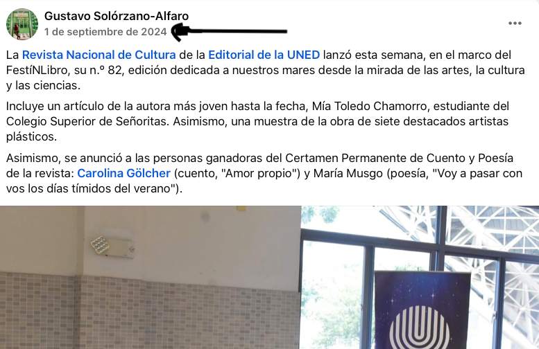 - Anuncio de Gustavo Solórzano Alfaro del lanzamiento de la Revista Cultura de la EUNED, donde aparece el poema “Voy a pasar con vos los días tímidos del verano” firmado por María Musgo (1 de septiembre de 2024):