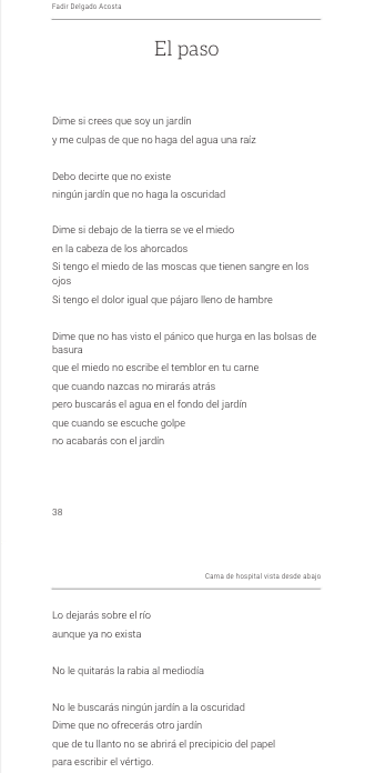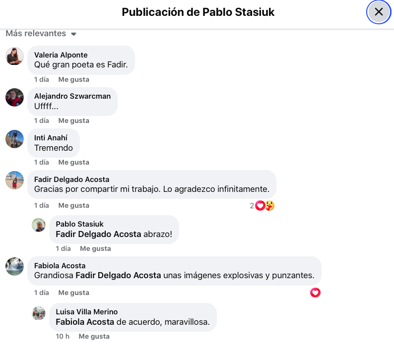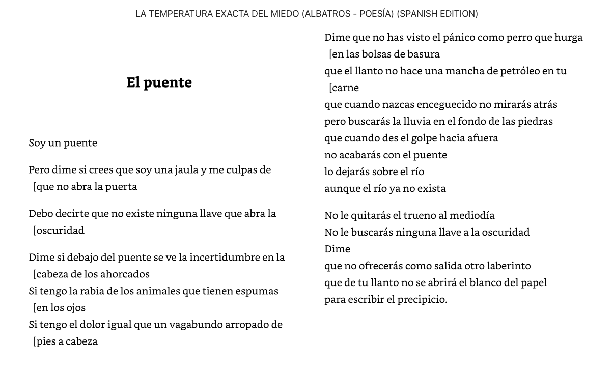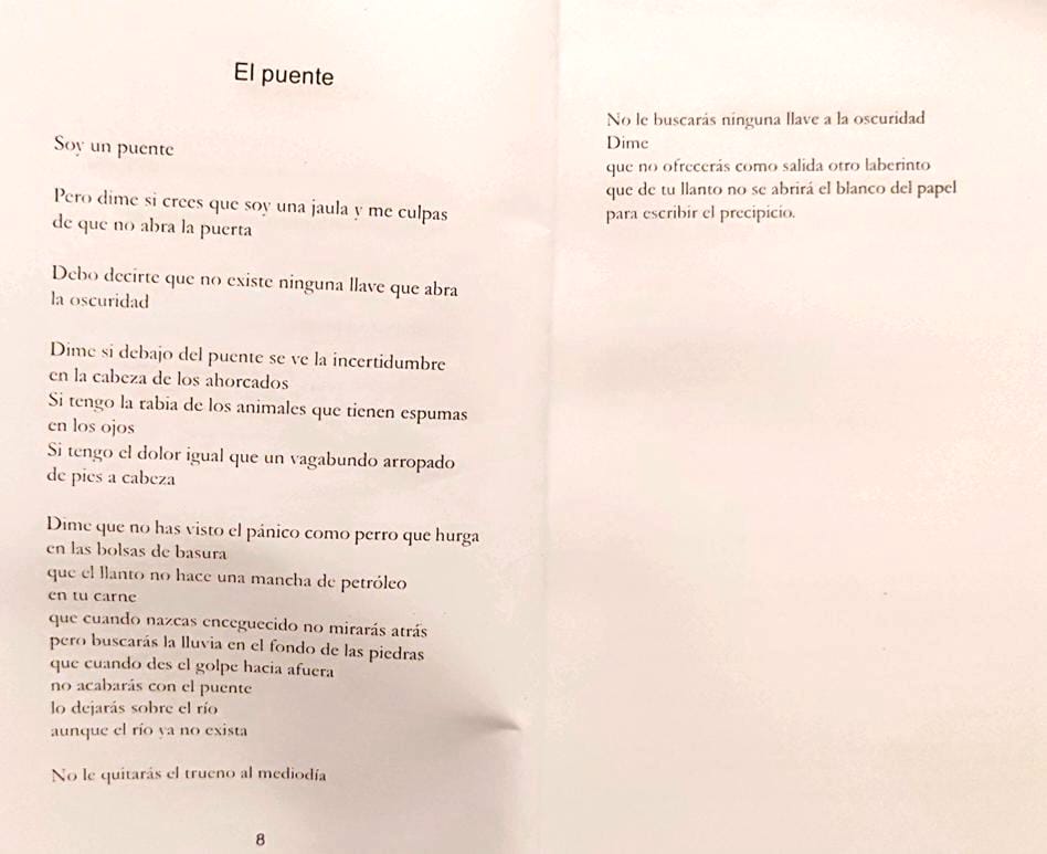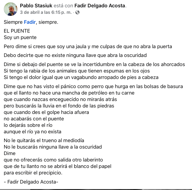 Bueno, de este poema compartido, el 3 de abril de 2025, por Pablo Stasiuk, puedo decir varias cuestiones, entre ellas, respecto a su dinámica operativa: 1) Es comentado por troles (perfiles falsos de Facebook), 2) recibe el agradecimiento de Fadir Delgado Acosta, tras valorar y compartir lo que considera como "su trabajo" 3) es alabado por la madre de Fadir Delgado Acosta, Fabiola Acosta, directora de la Fundación Casa de Hierro, 4) hay presencia de masas populares, hijas de una época que no se detiene y prefiere correr entre el humo, 5) “El puente” pertenece a la página 28 de La temperatura exacta del miedo (Premio Tiflos 2021, España) y a las páginas 8 y 9 de Suturas (aspirante al Premio Nacional de Poesía Aquileo J. Echeverría 2024, Costa Rica) y 6) “El puente” es una versión pobre (en el ámbito creativo) y alterada (en el plano ético) que aparece como “El paso” en Cama de hospital vista desde abajo (Premio UNA PALABRA, 2020, Costa Rica). Y cierro esta lista de entregas virtuales con estas preguntas: ¿cuántas versiones de “El puente” existen? ¿Solo de “El puente”? ¿Cuántas variantes de Ápate hay? ¿Existen metamorfosis masculinas o acaso amorfas? FIN…