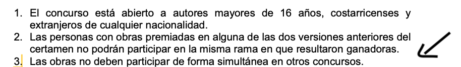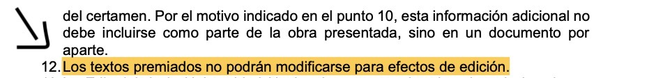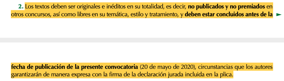 En este caso, debido a que la autora envió un libro que en apariencia "modifica" (sostengo que esto es parte del modus operandi de cacería de premios) después del 20 de mayo de 2020 y cuyos textos no son originales ni inéditos en su totalidad, existe, de inmediato, un incumplimiento de la declaración jurada incluida en la plica. Además, véase la siguiente normativa: