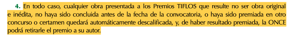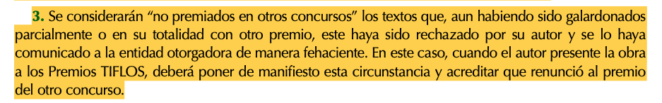 Dicho esto, el libro cuyo premio debería remitirnos a un problema más serio y legal respecto a las bases comentadas y analizadas es La temperatura exacta del miedo, pues es posterior al Premio UNA PALABRA y, por tal razón, es producto de "textos premiados" que fueron modificados. Asimismo, ya de por sí incumple las propias bases del Premio TIFLOS en su edición 2020, las cuales aclaran lo siguiente: